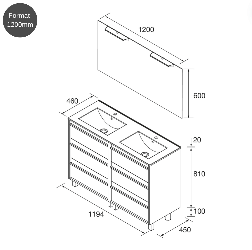 Le meuble de salle de bain Attila est disponible en 600, 800, 1000 ou 1200 mm avec une profondeur de 45 mm.
