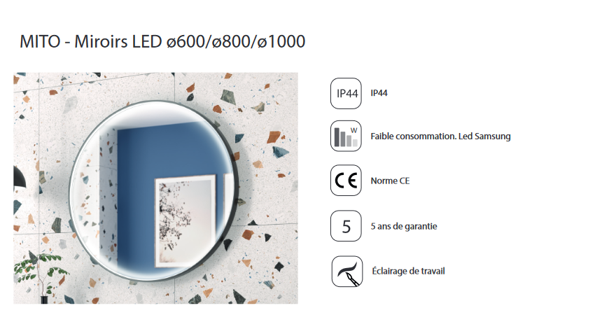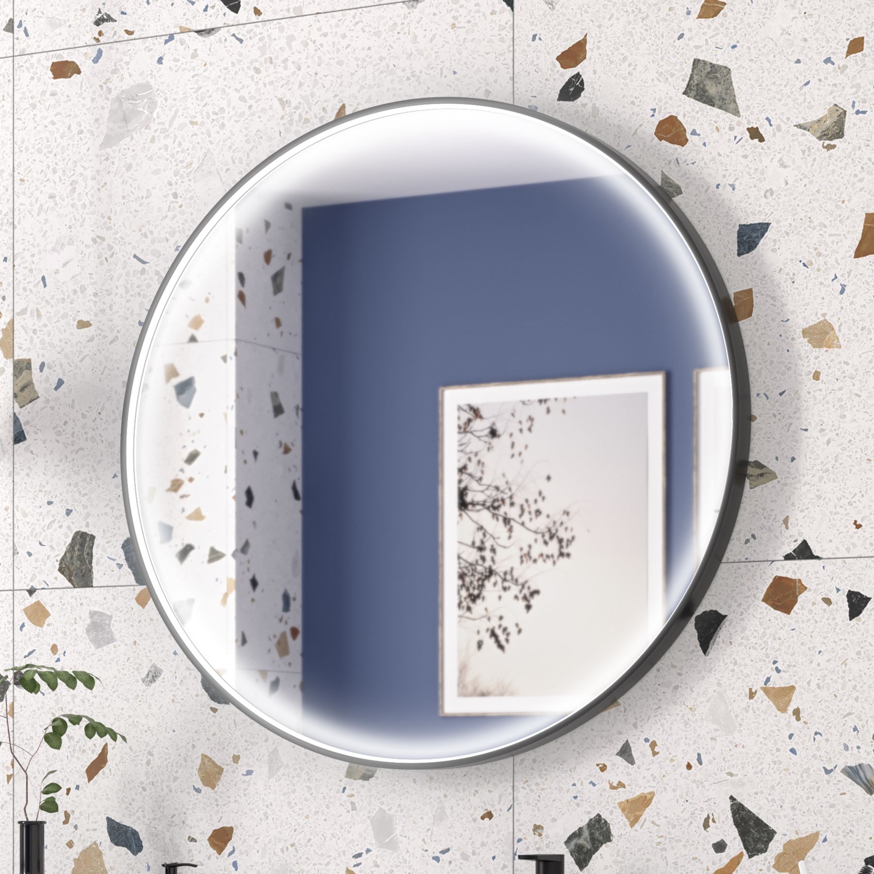 La garniture noire méticuleusement conçue ajoute non seulement une touche moderne, mais encadre également parfaitement l’éclairage LED entourant le miroir, disponible en trois tailles différentes, 600, 800 et 1000.