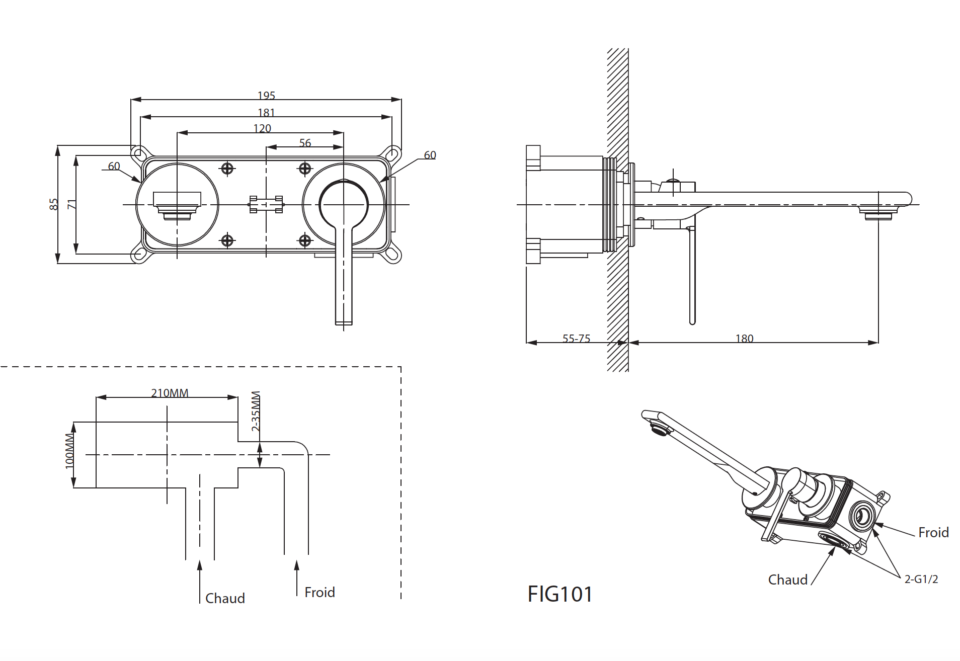 Mitigeur encastré 2 trous
